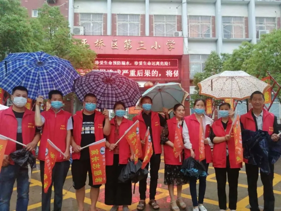 本網(wǎng)消息:“來,來!慢點!打好傘!排隊走!” 6月22日,華新信陽公司3名志愿者在雨中維護平橋區(qū)第三小學學校路口交通秩序,幫助小學生安全過馬路。